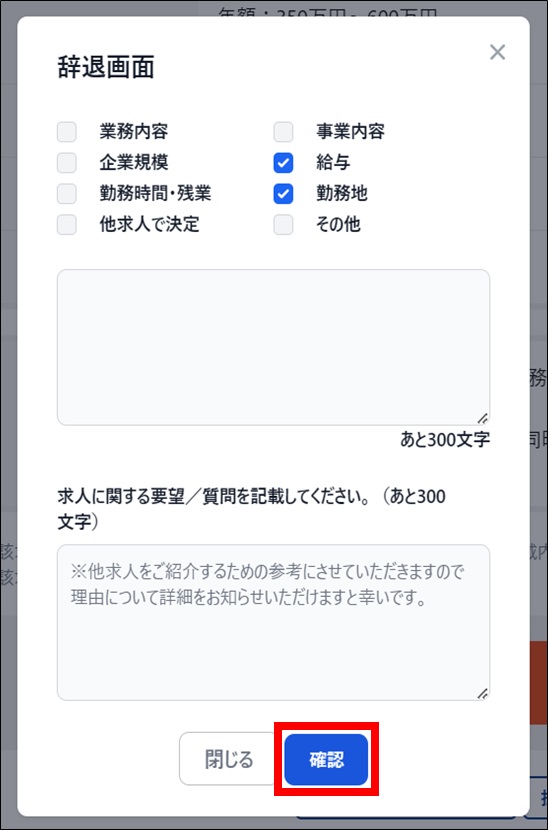 当該求人の紹介に対して辞退の意思を伝えたい場合は、【辞退】ボタンをクリックしてください。